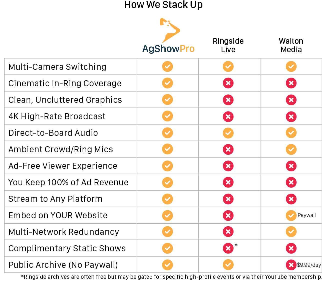 We don’t turn your prestigious show into a billboard for our own sponsors. We provide a professional clean-screen experience that keeps the focus on your animals, not a rolling ad for a feed company that didn't even sponsor your show. Got your own sponsors? Read on.